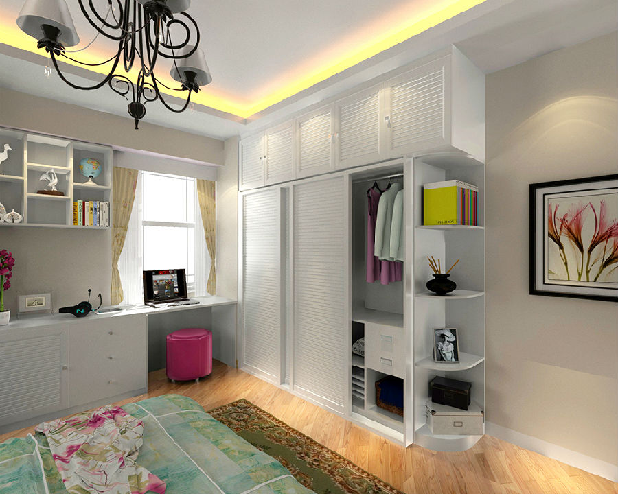 百葉造型直接映入眼簾,與純白色的衣柜相呼應,二者的美好結合,營造出一種青春靚麗的時尚氛圍。燈光下,屋內的陳設熠熠生輝,尤其是空間中大面積使用的繁花圖,給人一種清新脫俗的雅致感。